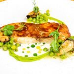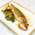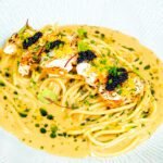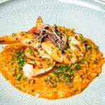 €25.80 Grilled Shrimp RisottoRisotto with lobster bisque, cherry tomatoes, dill oil and spring onions, de glazed with cognac. €48 Lobster With Fresh SpaghettiSpaghetti with lobster bisque, cherry tomatoes, dill oil and spring onions, deglazed with cognac. €26.40 Shi Drum FilletShi Drum with smoked bacon , pickled mussel , peas and mussel sauce. €75-100/kg Fresh grilled fish of the daySeasonal Greens , Jacket Potato and Dashi oil & Lemon Dressing.